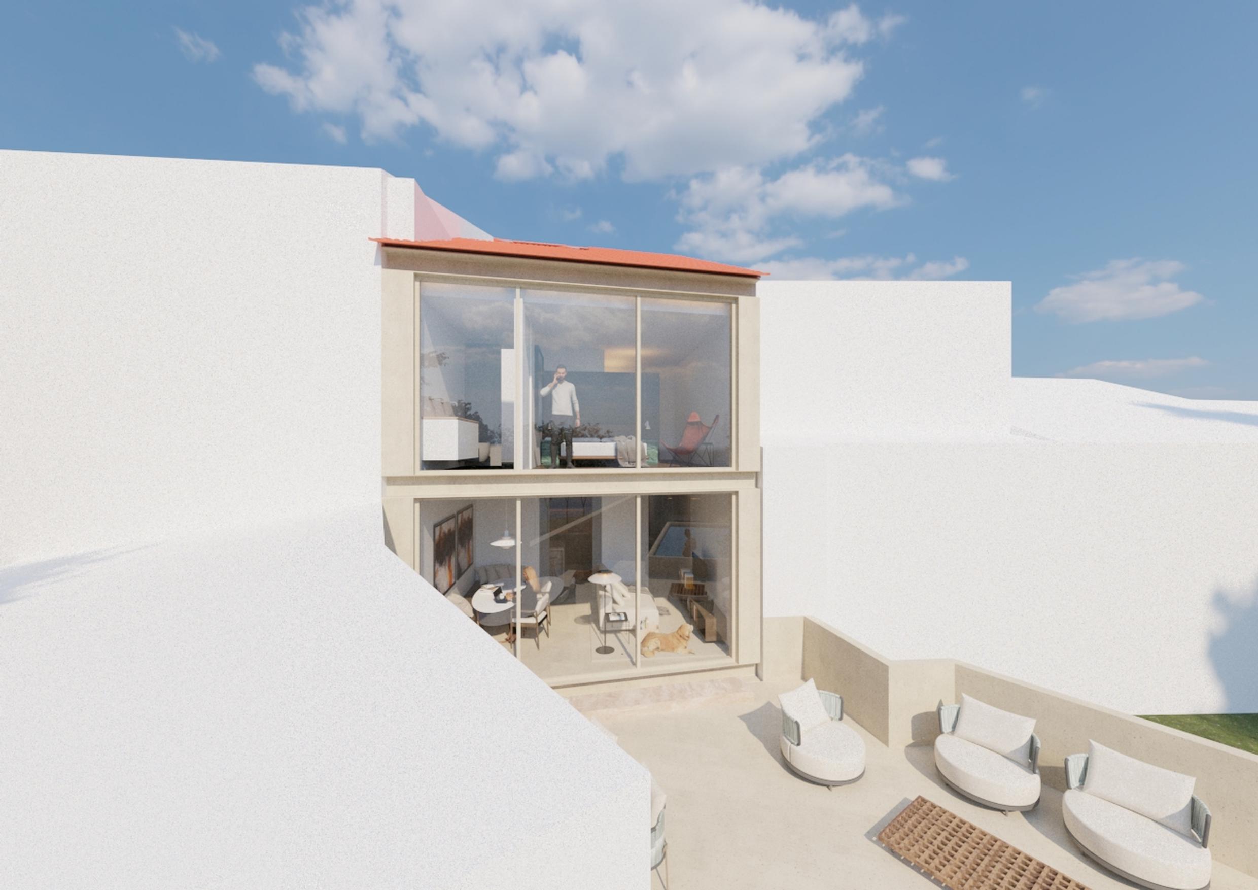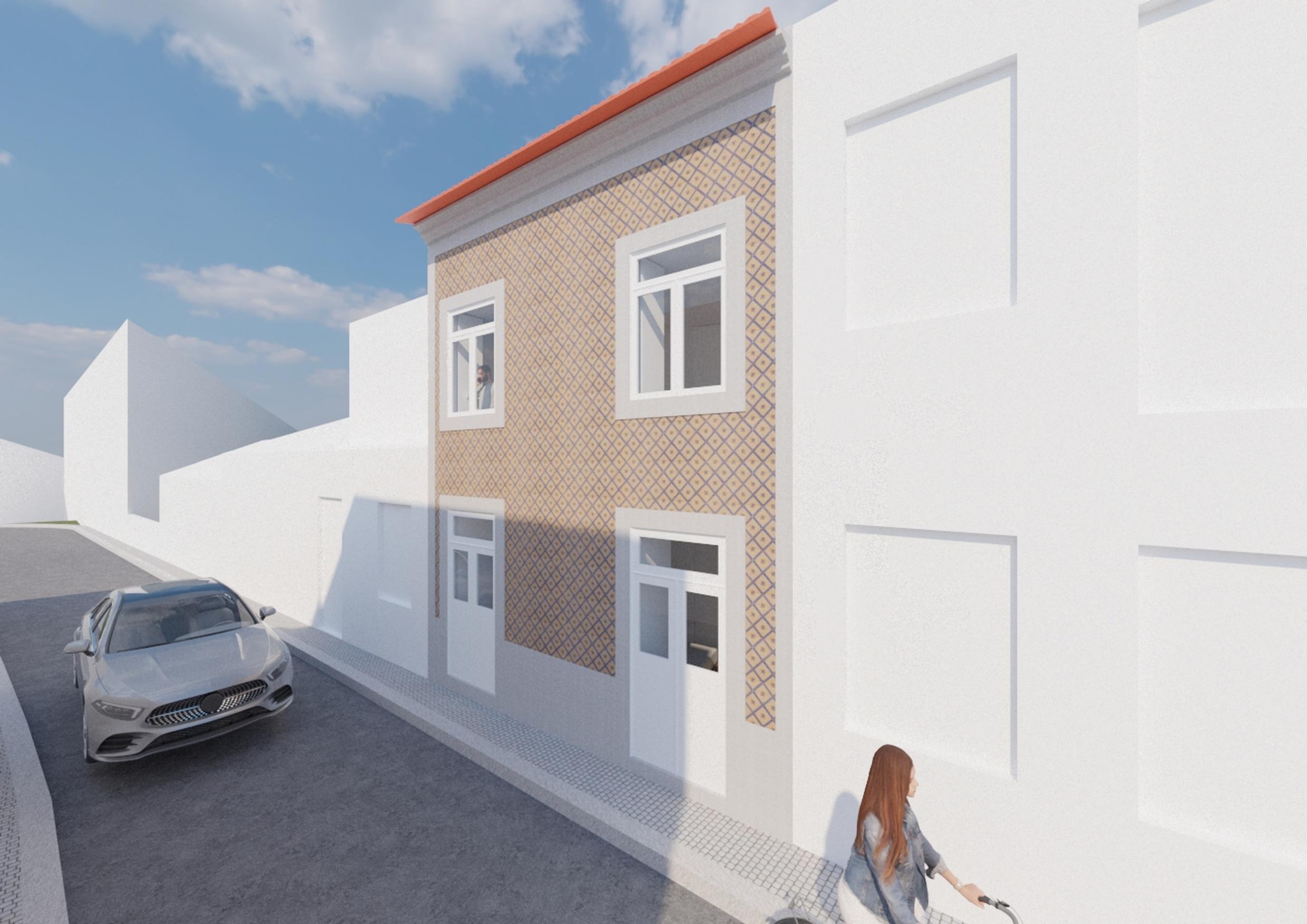 The main façade has interior shutters that balance privacy and natural light, while the rear façade is redesigned with exposed concrete and glazed planes, framing the house in the urban context of historic Porto.