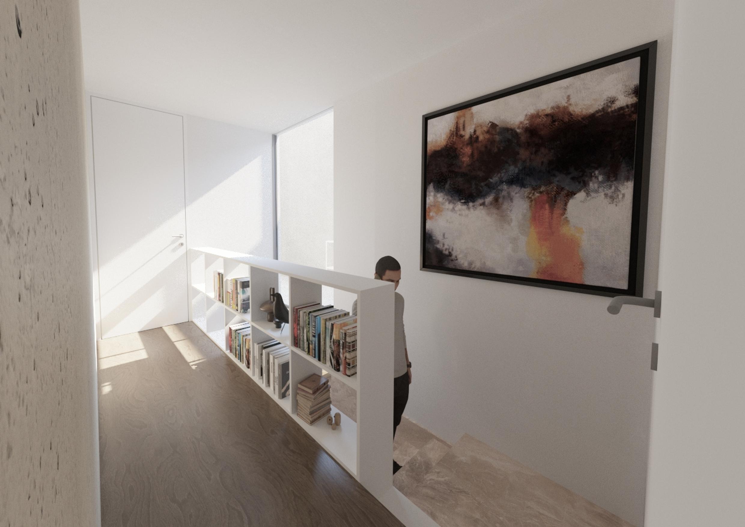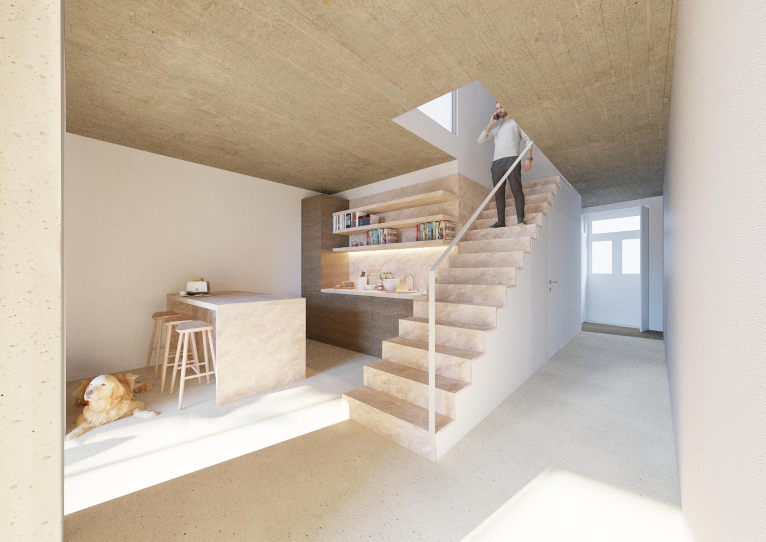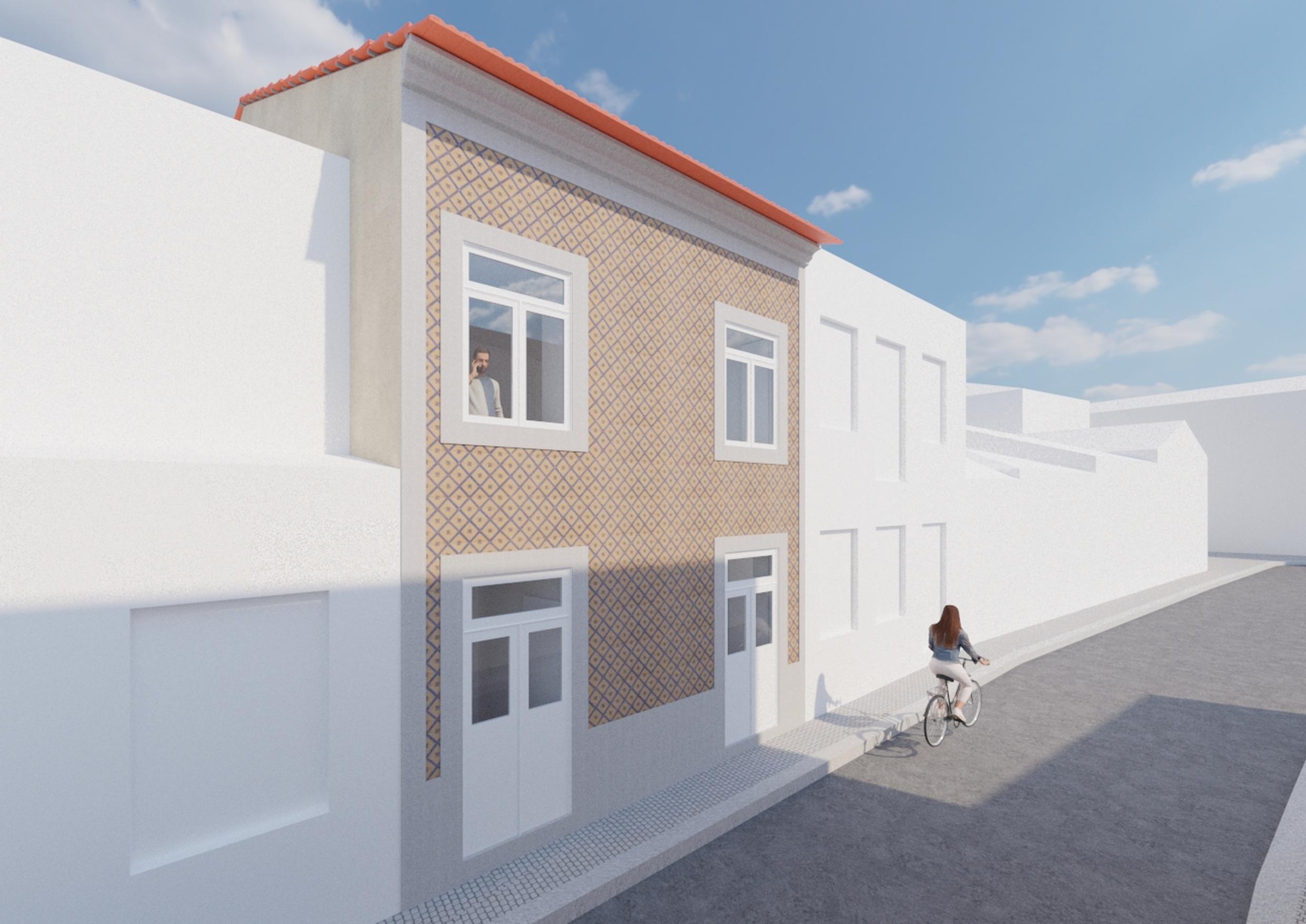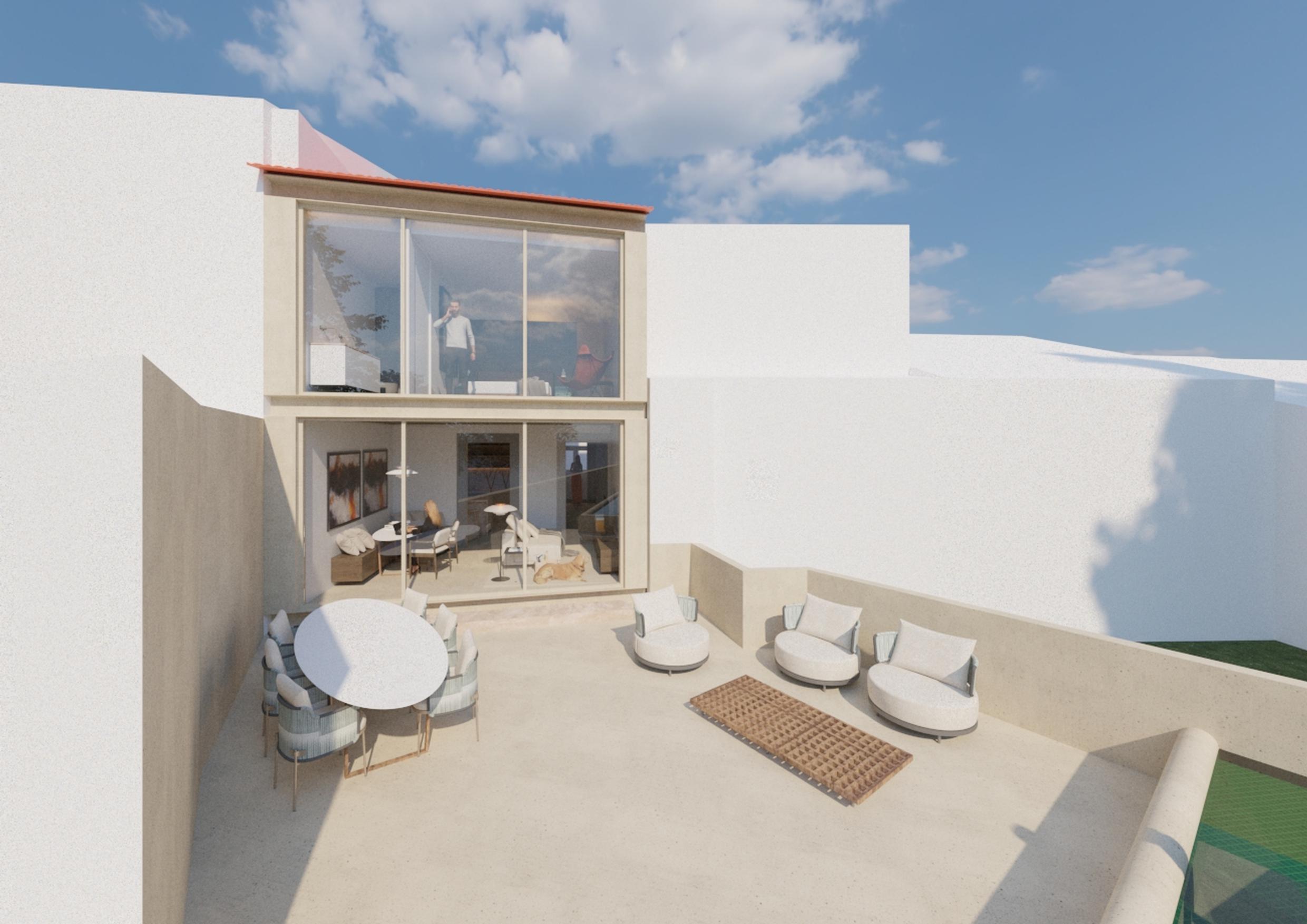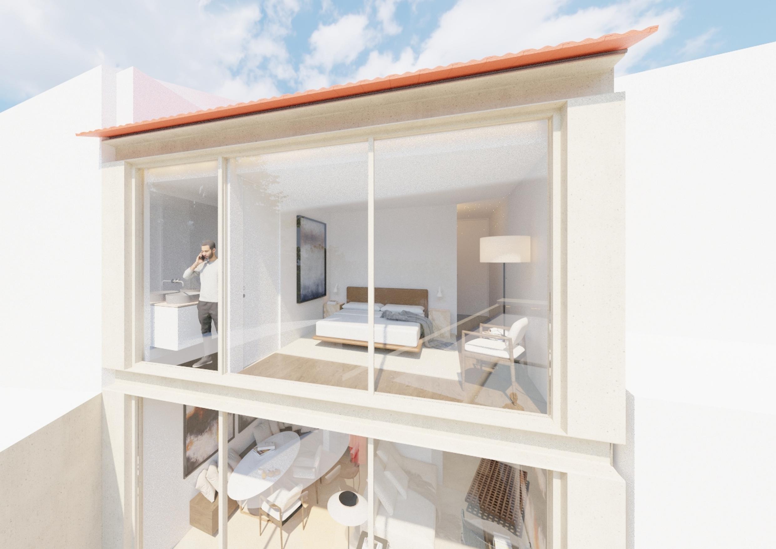 The upper floor, reserved for everyday life, houses the double bedroom and the guest room, as well as an autonomous suite prepared for local accommodation with independent access from the street. A single toilet serves this level, reinforcing simplicity and accessibility. The kitchen with island connects with the living and dining rooms, combining visual comfort with functionality. Integrated furniture and storage areas ensure flexible, family-friendly use.
