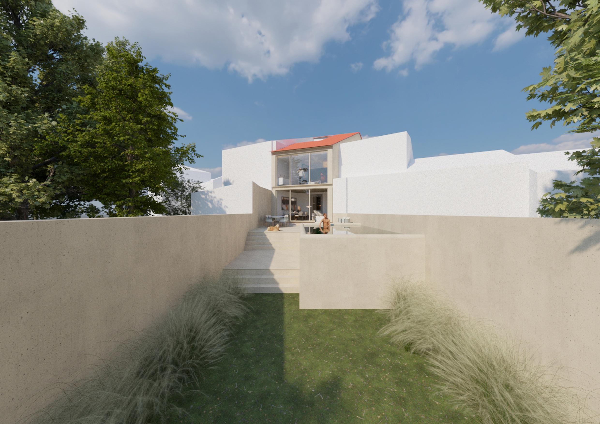 The existing vineyard is relocated and becomes a central element of the outdoor space, providing shade and a natural, welcoming dining area.