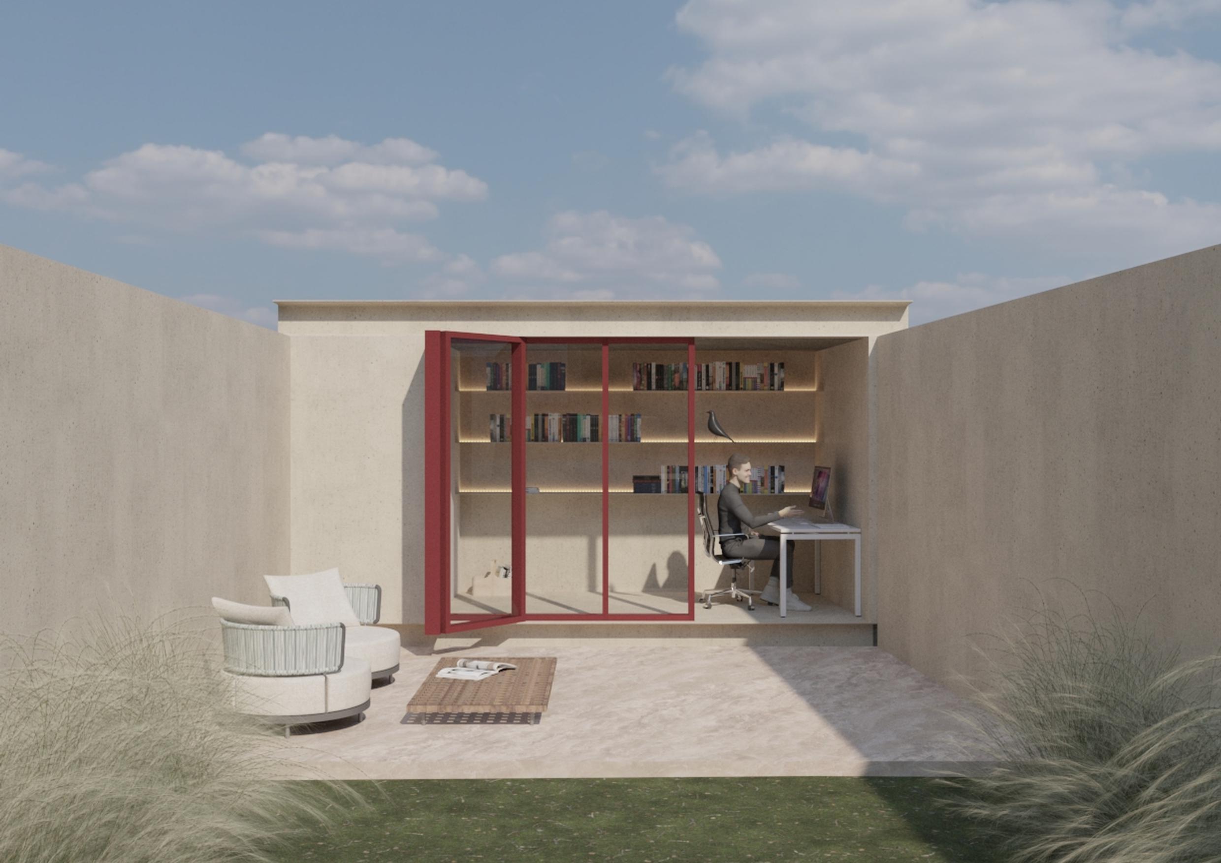 The lower floor opens up to the garden expansion, housing the future swimming pool or pond and outdoor dining areas. The unevenness of the terrain is worked into the interior, creating continuity between inside and outside and transforming the space into a fluid experience. A glazed office volume completes the house and sits discreetly on the edge of the plot; the transparency of this annex allows light and the landscape to be a constant presence, without intruding on the intimacy of the house.
