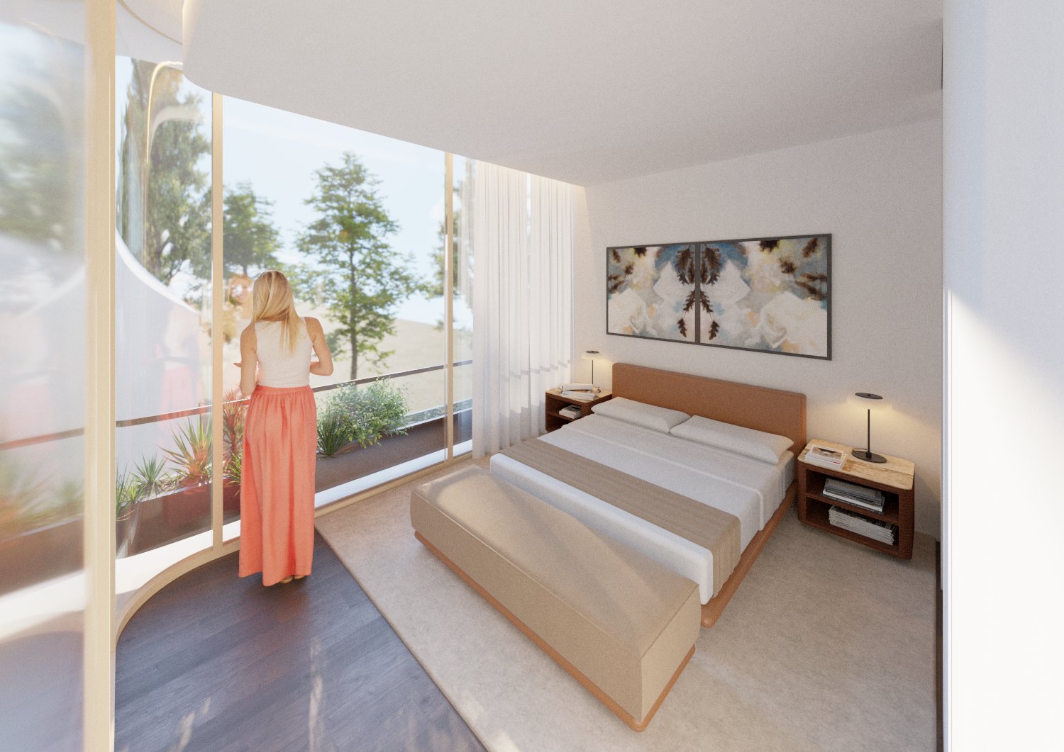 El uso de grandes ventanales y balcones permite que la luz natural llene los espacios interiores, creando una sensación de continuidad entre el interior y el exterior.
